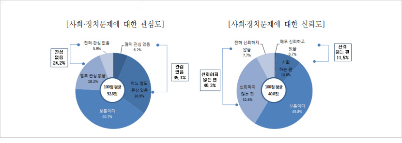 - 청소년 1,000명을 대상으로 사회·정치문제에 대한 관심도를 조사한 결과, 청소년 35.1%는 사회·정치문제 대해 ‘관심있다’는 의견(많이 관심 있음 : 6.2% + 어느 정도 관심 있음 : 28.9%)으로 나타난 반면, 24.2%는 ‘관심없다’는 것(별로 관심 없음 : 18.3% + 전혀 관심 없음 : 5.9%)으로 나타남.(‘보통이다’ : 40.7%)