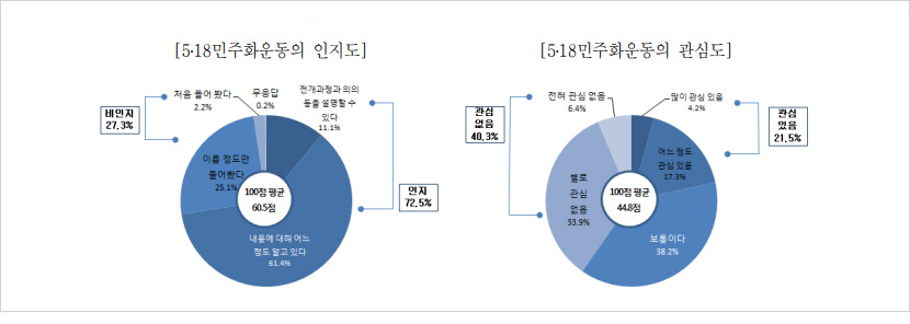 - 청소년 1,000명을 대상으로 5·18민주화운동에 대한 인식조사 결과, 청소년 72.5%는 5·18민주화운동에 대해서 전개과정과 의의 등을 설명할 수 있거나 내용에 대해 어느 정도 알고 있는 것(전개과정과 의의 등을 설명할 수 있다 : 11.1% + 내용에 대해 어느 정도 알고 있다 : 61.4%)으로 나타난 반면, 27.3%는 이름 정도만 들어봤거나 처음 들어본 것(이름 정도만 들어봤다 : 25.1% + 처음 들어봤다 : 2.2%)으로 나타났으며 무응답은 0.2%로 나타남.