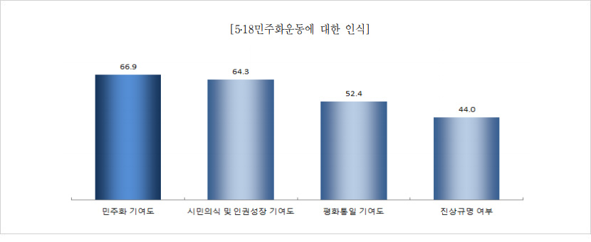 - 5·18민주화운동에 대한 인식은 민주화 기여도(66.9%) > 시민의식 및 인권신장 기여도(64.3%) > 평화통일 기여도(52.4%) > 진상규명 여부(44.0%)의 순으로 나타남.