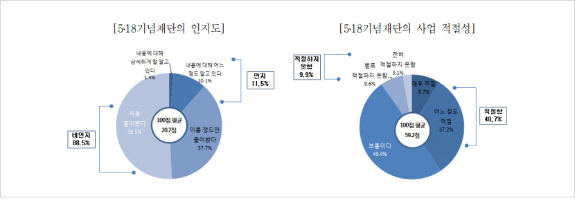 - 5·18기념재단에 대해 청소년 11.5%는 상세히 잘 알고 있거나 내용에 대해 어느 정도 알고 있는 것(내용에 대해 상세하게 잘 알고 있다 : 1.4% + 내용에 대해 어느 정도 알고 있다 : 10.1%)으로 나타난 반면, 88.5%는 이름 정도만 들어봤거나 처음 들어본 것(이름 정도만 들어봤다 : 37.7% + 처음 들어봤다 : 50.8%)으로 나타남.