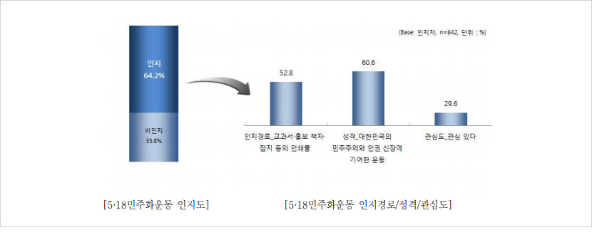 - 5·18민주화운동 인지경로는 ‘교과서·홍보 책자·잡지 등의 인쇄물’이 52.8%로 가장 높게 나타남. 5·18민주화운동의 성격은 ‘대한민국의 민주주의와 인권 신장에 기여한 운동’이 60.6%로 가장 높게 나타났고, 평소 5·18민주화운동에 관심 있다는 의견은 29.6%로 나타난 반면, 관심 없다는 의견은 19.9%로 나타남.