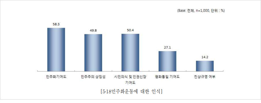 - 5·18민주화운동에 대한 인식은 민주화 기여도(58.3%) > 시민의식 및 인권신장 기여도(50.4%) > 민주주의 상징성(49.8%) > 평화통일 기여도(27.1%) > 진상규명 여부(14.2%)의 순으로 나타남.