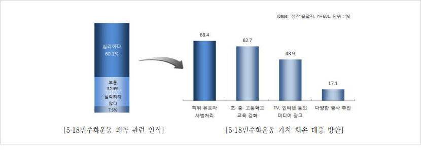 - 5·18민주화운동에 대한 비방과 왜곡과 관련해서 청소년 중 60.1%는 심각한 문제로 인식하였으며, 5·18민주화운동의 의미와 가치를 훼손하는 일에 대한 가장 시급한 대응방안은 ‘허위 유포자 사법처리’가 68.4%로 가장 높게 나타나고, 다음으로 ‘초·중·고등학교 교육 강화’(62.7%) > ‘TV, 인터넷 등의 미디어 광고’(48.9%) > ‘다양한 행사 추진’(17.1%) 등의 순으로 나타남.