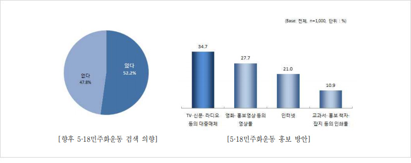 - 5·18민주화운동을 홍보하기 위한 가장 적합한 방법은 ‘TV·신문·라디오 등의 대중매체’가 34.7%로 가장 높게 나타나고, 다음으로 ‘영화·홍보영상 등의 영상물’(27.7%) > ‘인터넷’(21.0%) > ‘교과서·홍보책자·잡지 등의 인쇄물’(10.9%)등의 순으로 나타남.