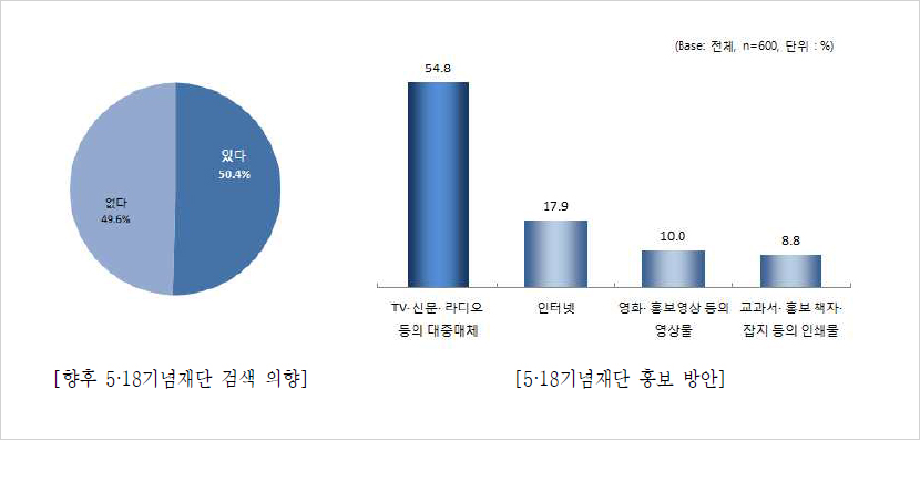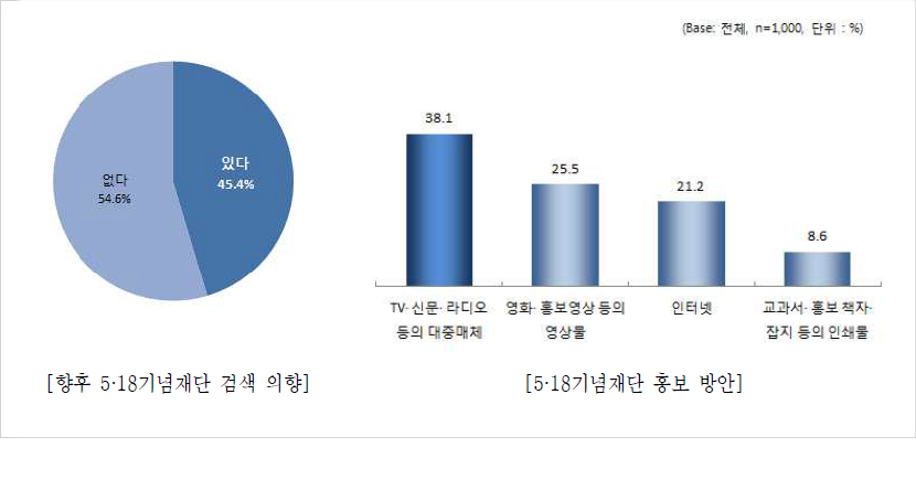 찾아볼 의향이 있다는 응답자는 45.4%로 나타났으며, 5․18기념재단을 홍보하기