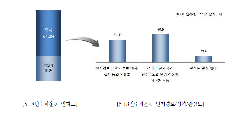 - 청소년의 64.2%는 5․18민주화운동에 대해 알고 있는 것으로 나타남.