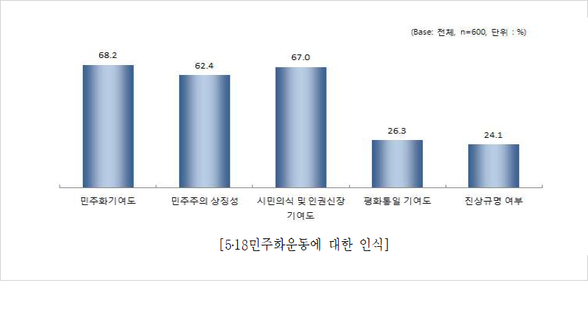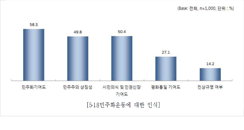 - 5․18민주화운동에 대한 인식은 민주화 기여도(58.3%) > 시민의식 및 인권신장