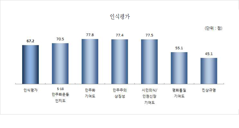 2013년(69.8점) 대비 2.6점 하락함. 인식평가는 ‘민주화 기여도’, ‘시민의식 및