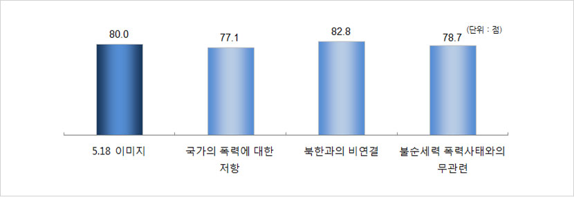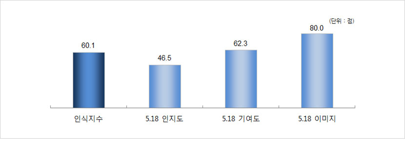 - 2016년 5·18 국민인식지수는 60.1점으로 나타남. 5·18국민인식지수의 항목별로는 5·18 이미지가 80.0점으로 가장 높고, 다음으로 5·18 기여도(62.3점), 5·18 인지도(46.5점)의 순으로 나타남.