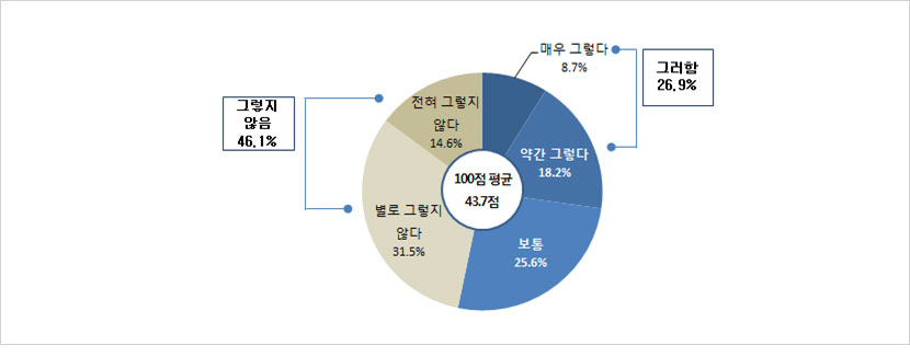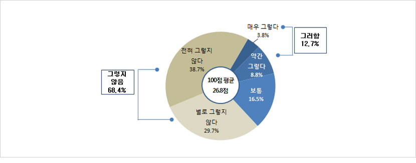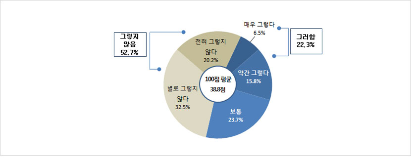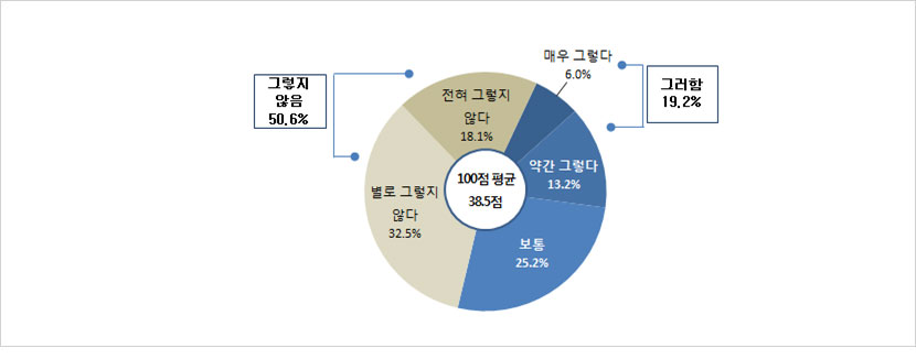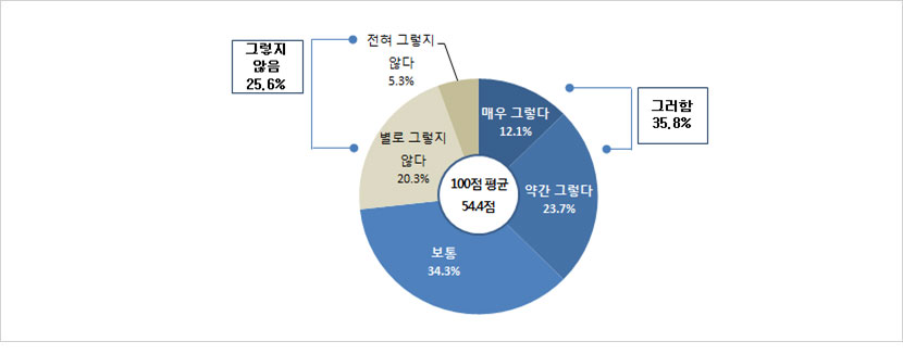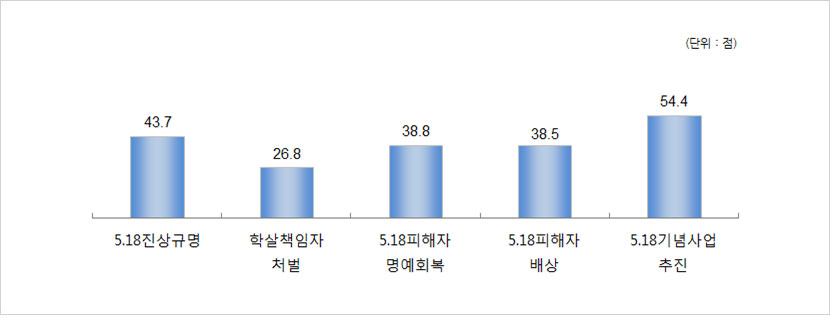 - 5·18 기념사업 추진은 잘 이루어졌다는 질문에 ‘그렇다’는 35.8%(매우 그렇다 : 12.1% + 약간 그렇다 : 23.7%)로 나타난 반면, ‘그렇지 않다’는 25.6%(전혀 그렇지 않다 : 5.3% + 별로 그렇지 않다 : 20.3%)로 나타남. (보통: 34.3%, 모름: 4.3%)100점 만점으로 환산했을 때 54.4점으로 나타남.