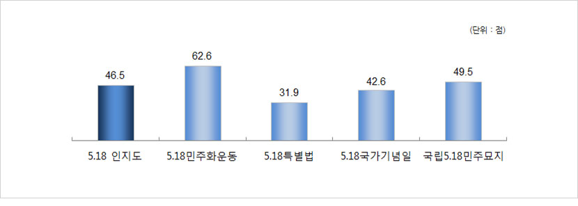 - 5·18 인지도는 46.5점으로 나타남. 5·18 인지도의 항목별로 살펴보면 5·18민주화운동이 62.6점으로 가장 높고, 다음으로 국립5·18민주묘지(49.5점), 5·18민주화운동 국가기념일(42.6점), 5·18특별법(31.9점)의 순으로 나타남.