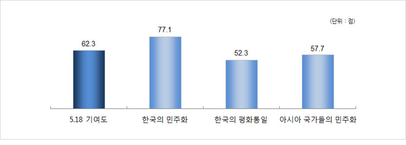 - 5·18 기여도는 62.3점으로 나타남. 5·18 기여도의 항목별로 살펴보면 한국의 민주화가 77.1점으로 가장 높고, 다음으로 아시아 국가들의 민주화(57.7점), 한국의 평화통일(52.3점)의 순으로 나타남.