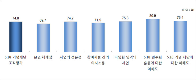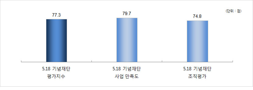 - 5·18 기여도는 5·18민주화운동 인지자가 66.2점으로 비인지자(52.6점) 보다 높게 나타났고, 5·18기념재단 인지자가 68.6점으로 비인지자(60.2점) 보다 높게 나타남.