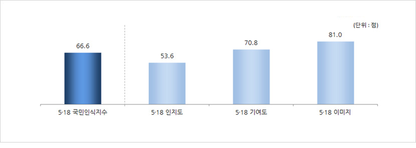 - 2017년 5·18 국민인식지수는 66.6점으로 나타남. 5·18 국민인식지수의 항목별로는 5·18 이미지가 81.0점으로 가장 높고, 다음으로 5·18 기여도(70.8점), 5·18 인지도(53.6점)의 순으로 나타남.