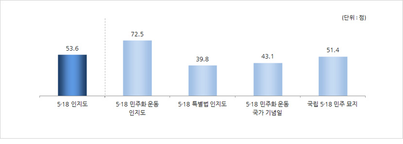 - 5·18 인지도는 53.6점으로 나타남. 5·18 인지도의 항목별로 살펴보면 5·18민주화운동 인지도(인지: 86.8%)가 72.5점으로 가장 높고, 다음으로 국립5·18민주묘지(51.4점, 인지: 64.5%), 5·18민주화운동 국가기념일(43.1점, 인지: 53.6%), 5·18특별법(39.8점, 인지: 48.3%)의 순으로 나타남.