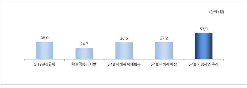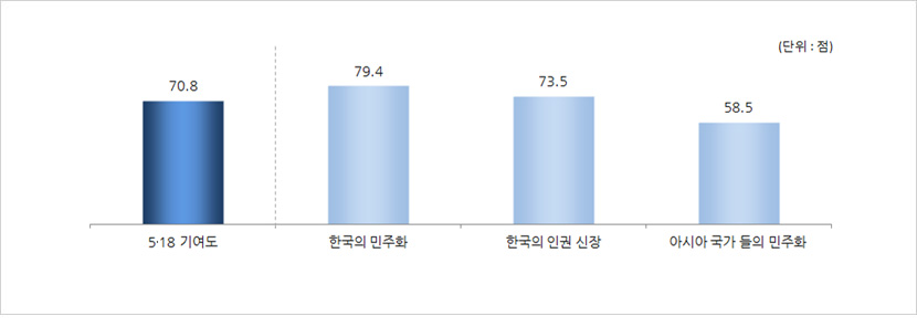 - 5·18 기여도는 70.8점으로 나타남. 5·18 기여도의 항목별로 살펴보면 한국의 민주화(기여했다: 75.9%)가 79.4점으로 가장 높고, 다음으로 한국의 인권신장(73.5점, 기여했다: 67.9%), 아시아 국가들의 민주화(58.5점, 기여했다: 41.6%)의 순으로 나타남.