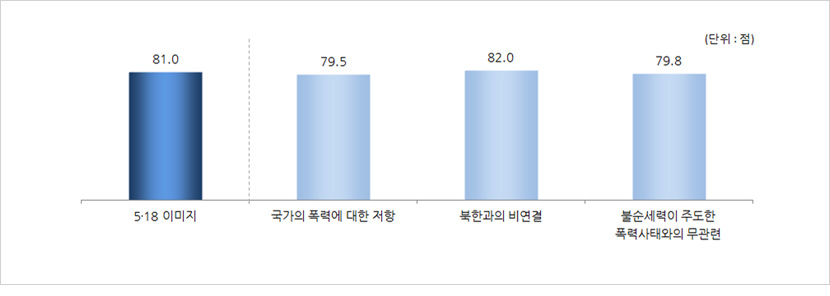 - 5·18 이미지는 81.0점으로 나타남. 5·18 이미지의 항목별로 살펴보면 북한과의 비연결(연결되어 있지 않다: 77.3%)이 82.0점으로 가장 높고, 다음으로 불순 세력이 주도한 폭력사태와의 비관련(79.8점, 관련 없다: 74.9%), 국가의 폭력에 대한 저항(79.5점, 동의한다: 77.1%)의 순으로 나타남.