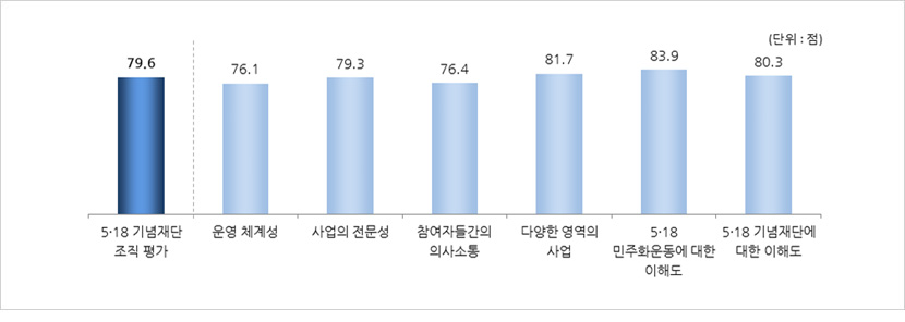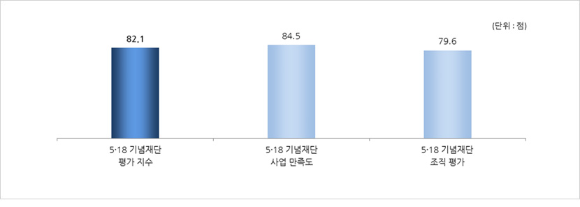 - 2017년 5·18기념재단 평가지수는 82.1점으로 나타남. 5·18기념재단 평가지수의 항목별로는 5·18기념재단 사업 만족도가 84.5점, 5·18기념재단 조직평가가 79.6점으로 나타남.