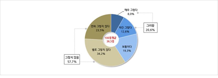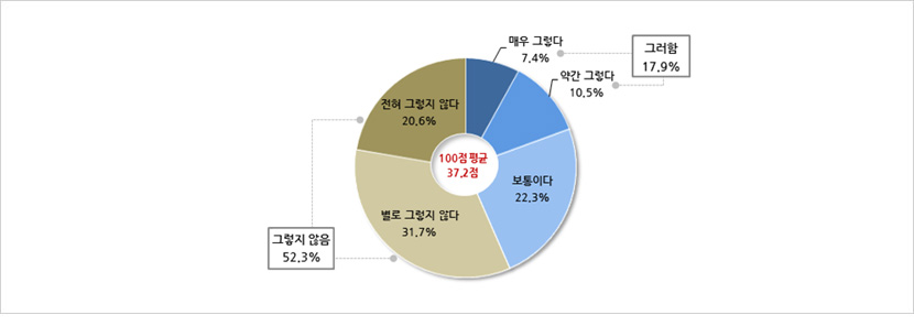 - 5·18기념재단 평가지수는 5·18기념행사(사업)를 '만족'한 응답자가 86.5점으로 ‘불만족’한 응답자(35.4점)보다 높게 나타났고, 5·18기념재단 ‘인지자’가 83.0점으로 ‘비인지자’(78.9점) 보다 높게 나타남.