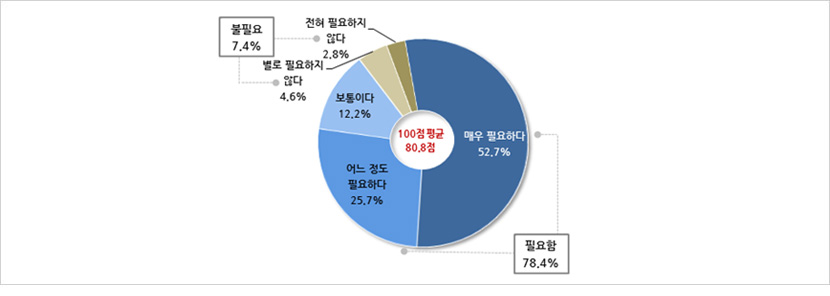 - 5·18 특별법 개정의 필요성을 물어본 결과, 78.4%는 5·18 특별법개정이 ‘필요하다’(매우 필요하다 : 52.7% + 어느 정도 필요하다 : 25.7%)라고 응답한 반면, 7.4%는 ‘필요하지 않다’(전혀 필요하지 않다 : 2.8% + 별로 필요하지 않다 : 4.6%)라고 응답함. (보통: 12.2%, 무응답: 2.0%) 100점 만점으로 환산했을 때 80.8점으로 나타남.