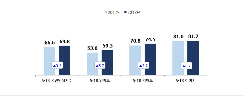 - 2018년 ‘5·18 국민인식지수’는 69.8점으로 2017년(66.6점)에 비해 3.2점 상승함