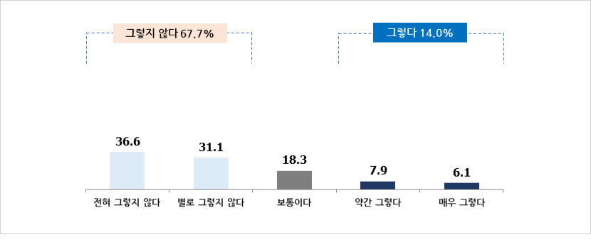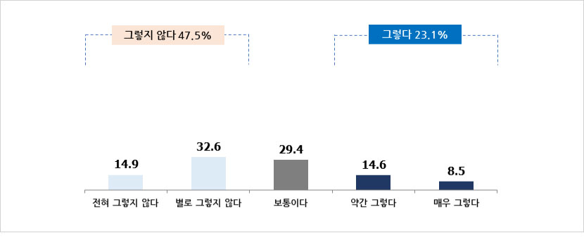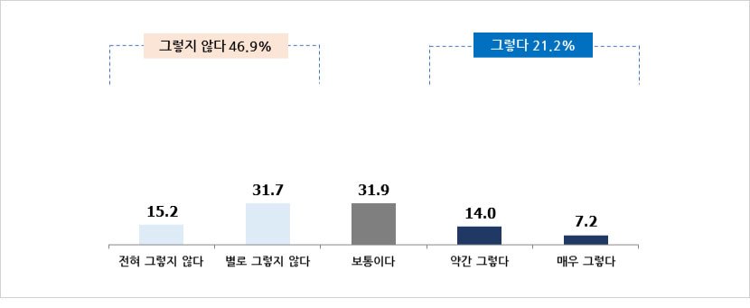 - ‘보통’은 31.9%, ‘그렇다(매우 그렇다 7.2% + 약간 그렇다 14.0%)’는 21.2%로 조사됨