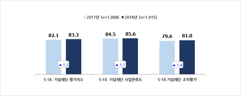 - 2018년 ‘5·18 기념재단 평가지수’는 83.3점으로 2017년(82.1점)에 비해 1.2점 상승함