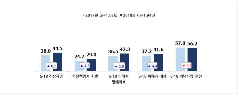 - 2018년 5·18 민주화운동의 올바른 해결을 위한 5가지 구현에 대한 쟁점은 ‘5·18 기념사업 추진’이 56.2점으로 가장 높고, ‘5·18 진상규명’(44.5점), ‘5·18 피해자 명예회복’(42.3점), ‘5·18 피해자 배상’(41.6점), ‘학살책임자 처벌’(29.0점) 순으로 조사됨