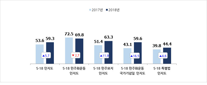 - 2018년의 ‘5·18 인지도’는 59.3점으로 2017년(53.6점)에 비해 5.7점 상승함