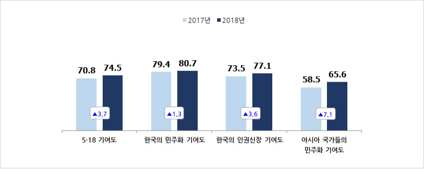 - 2018년 5·18 기여도는 74.5점으로 2017년(70.8점)에 비해 3.7점 상승함