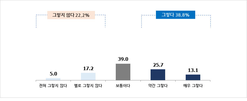 - ‘그렇다(매우 그렇다 13.1% + 약간 그렇지 25.7%)’는 38.8%, ‘그렇지 않다(전혀 그렇지 않다 5.0% + 별로 그렇지 않다 17.2%)’는 22.2%로 조사됨