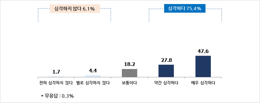 - ‘보통’은 18.2%, 심각하지 않다(전혀 심각하지 않다 1.7% + 별로 심각하지 않다 4.4%)’는 6.1%로 조사됨