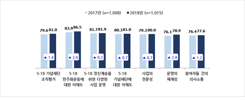 - 2018년 ‘5·18 기념재단 조직평가’는 81.0점으로 2017년(79.6점)에 비해 1.4점 상승함