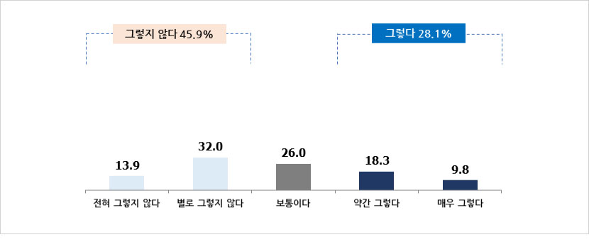 - ‘보통’은 26.0%, ‘그렇다(매우 그렇다 9.8% + 약간 그렇다 18.3%)’는 28.1%로 조사됨