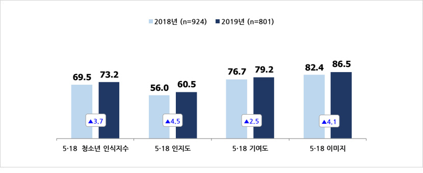 - 2019년 ‘5·18 청소년 인식지수’는 73.2점으로 2018년(69.5점)에 비해 3.7점 상승함