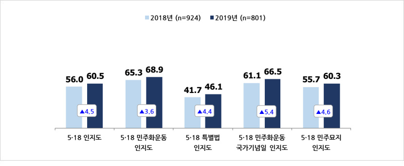 - 2019년의 ‘5·18 인지도’는 60.5점으로 2018년(56.0점)에 비해 4.5점 상승함