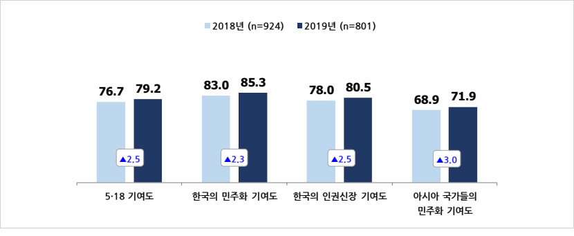 - 2019년 5·18 기여도는 79.2점으로 2018년(76.7점)에 비해 2.5점 상승함