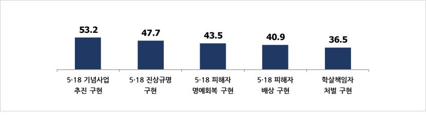 - 5·18 민주화운동 관련 ‘5가지 원칙’의 구현에 대해 ‘5·18 기념사업 추진’이 53.2점으로 가장 높게 나타났고, 다음으로 ‘5·18 진상규명 구현’(47.7점), ‘5·18 피해자 명예회복 구현’(43.5점), ‘5·18 피해자 배상 구현’(40.9점), ‘학살책임자 처벌 구현’(36.5점) 순으로 조사됨