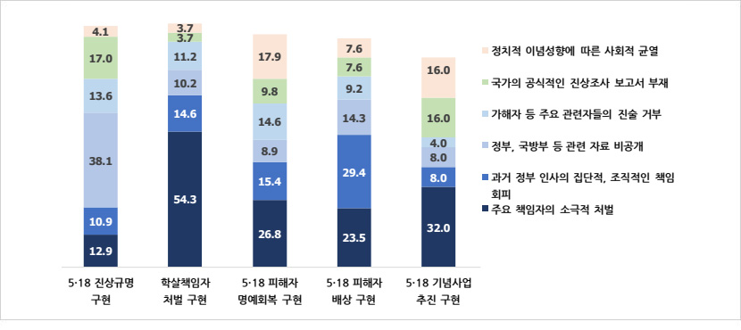 - ‘학살책임자 처벌’, ‘5·18 피해자 명예회복’, ‘5·18 기념사업 추진’은 ‘주요 책임자의 소극적 처벌’이 각각 54.3%, 26.8%, 32.0%로 가장 높게 나타났으며, ‘5·18 피해자 배상’은 ‘과거 정부 인사의 집단적, 조직적인 책임 회피’라고 응답한 비율 29.4%로 가장 높게 조사됨