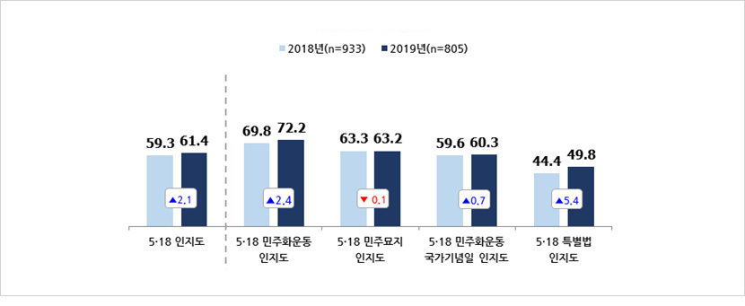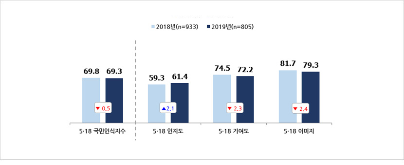 - 2019년 ‘5·18 국민인식지수’는 69.3점으로 2018년(69.8점)에 비해 0.5점 감소함