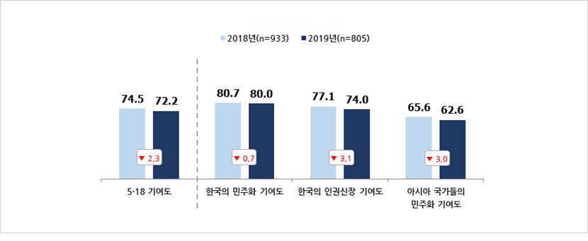 - 2019년 5·18 기여도는 72.2점으로 2018년(74.5점)에 비해 2.3점 감소함