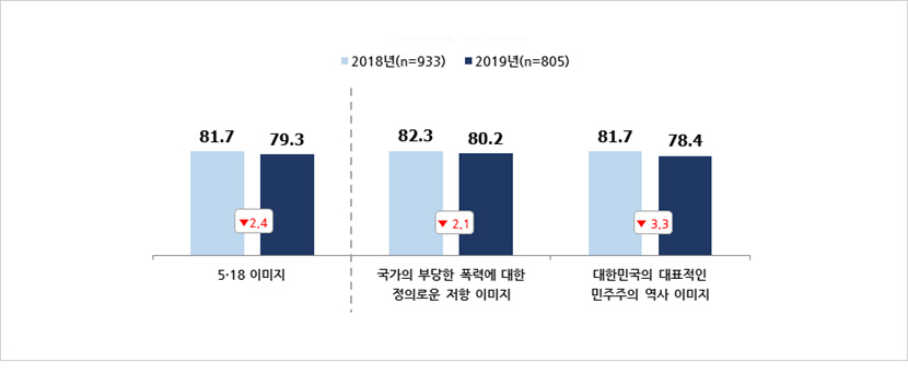 - 2019년 5·18 이미지는 79.3점으로 2018년(81.7점)에 비해 2.4점 감소함