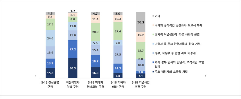 - 5가지 원칙별 해결이 미흡한 이유에 대해 ’피해자 명예회복’(28.0%), ’피해자 배상’(27.4%), ‘5·18 기념사업 추진’(25.7%)은 ‘정치적 이념성향에 따른 균열’ 때문이라는 응답이 가장 높게 나타남