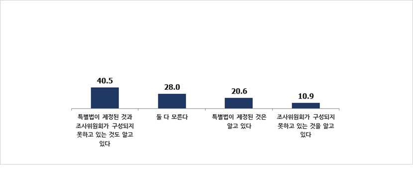 - ‘둘 다 모른다’는 28.0%, ‘특별법이 제정된 것은 알고 있다’(20.6%), ‘조사위원회가 구성되지 못하고 있는 것을 알고 있다’(10.9%) 순으로 나타남