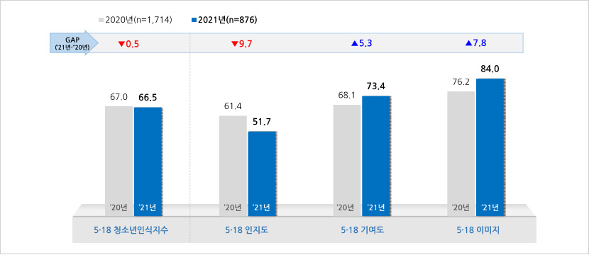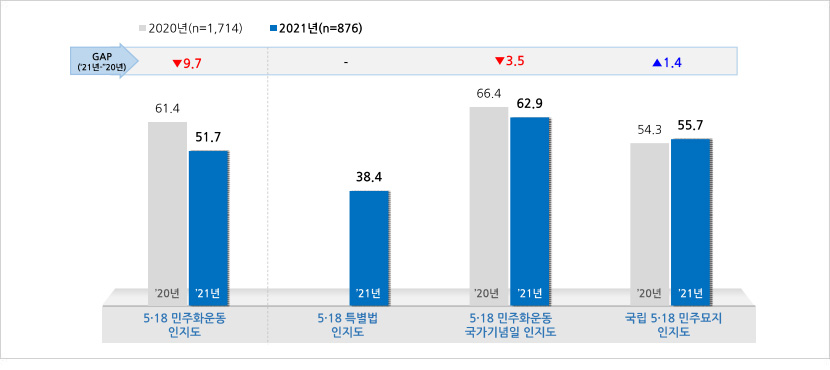 - 2021년 ‘5·18 인지도’는 51.7점으로 2020년(61.4점)에 비해 9.7점 감소함