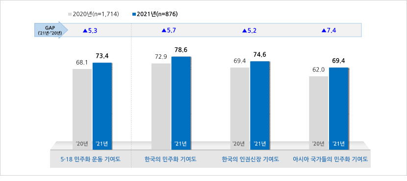 - 2021년 ‘5·18 기여도’는 73.4점으로 2020년(68.1점)에 비해 5.3점 상승함