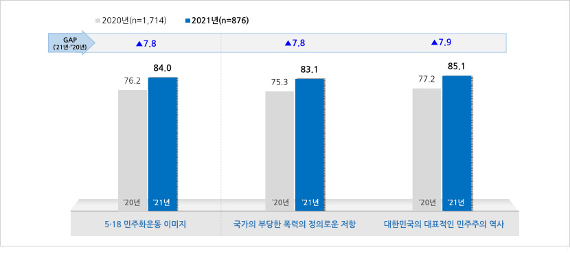 - 2021년의 ‘5·18 이미지’는 84.0점으로 2020년(76.2점)에 비해 7.8점 상승함