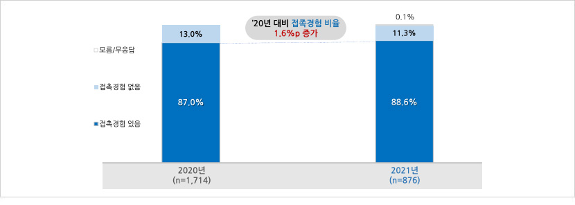 - 2021년 최근 1년간 5·18 민주화운동 관련 정보 접촉 경험이 있는 응답자는 88.6%로 전년 대비 1.6%p 상승함
