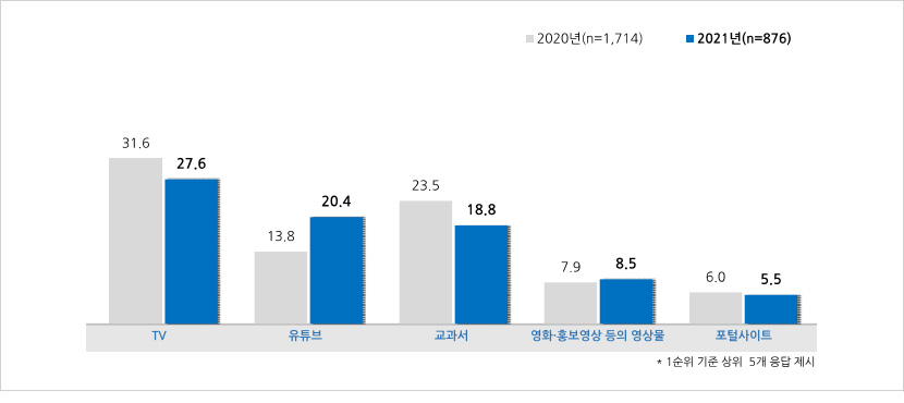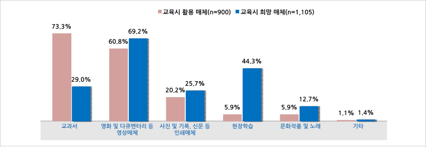 - 교육 시 활용하는 매체는 ‘교과서’가 73.3%로 가장 높고, 다음으로 ‘영화 및 다큐멘터리 등 영상매체(60.8%)’, ‘사진 및 기록, 신문 등 인쇄매체(20.2%)’ 등의 순으로 나타남
