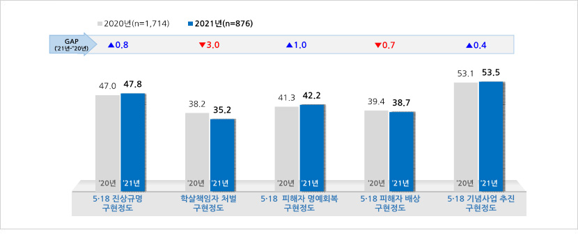 - 2021년 5·18 민주화운동 5가지 원칙 중 ‘5·18 기념사업이 잘 구현정도’의 응답이 53.5점으로 가장 높게 나왔으나 전년도 대비 소폭 상승(0.4점)함